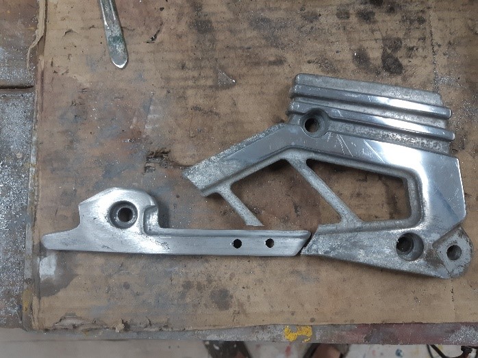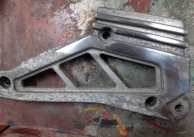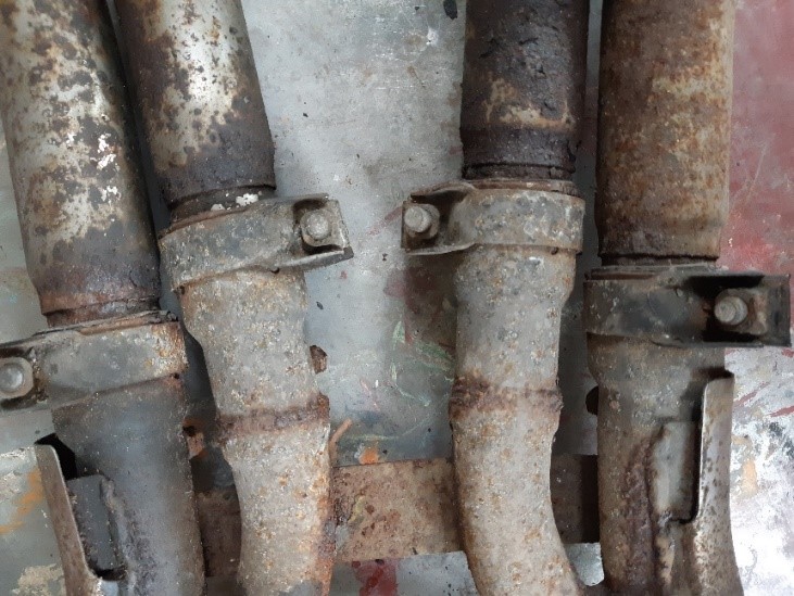 De bochten uit de collector gingen ook met moeite los door weer kruipolie te gebruiken. De collector ziet er beroerd uit, maar bij nadere inspectie zijn de metaaldelen toch nog “gezond”. Na het verwijderen van de sierplaten aan de zijkanten kan het schoonmaken en schuren beginnen.