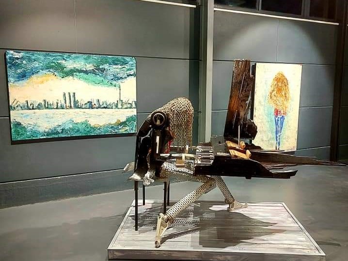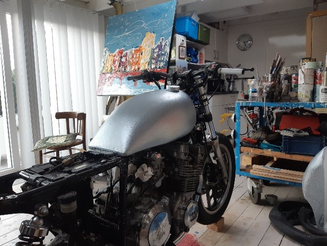 Toen kwam de dag dat ik in het kader van Beleef Zonnemaire aan een open atelier ronde kon deelnemen. Dus atelier open en dat is één grote speelplaats van schilderijen, beelden, ontwerpen, los slingerende attributen en een motorfiets in aanbouw. Kijk maar even rond op www.janbraber.nl