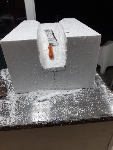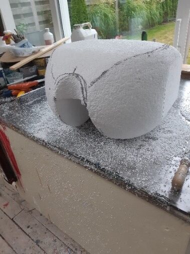 Nou had ik al bedacht dat het voor de bouwer van de tank handig zou zijn dat hij een zo exact mogelijk model zou hebben. Daartoe heb ik een paar blokken EPS (piepschuim) uit de modelbouwwereld aangeschaft. Uit één blok is een tank te maken.