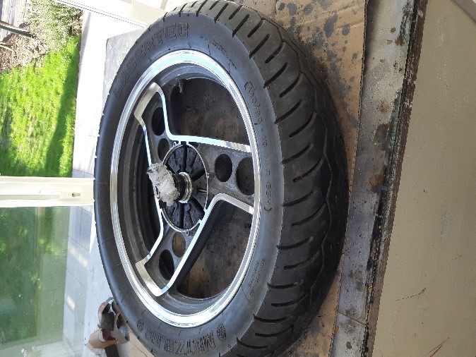 Het achterwiel als eerste dus. Het wiel is ernstig vervuild en aangetast, de motor heeft altijd buiten onder een afdakje gestaan en dat heeft in de loop van de jaren natuurlijk z’n uitwerking gehad op het aluminium. Schoonmaken en met afbijtmiddel de verflagen er af schrappen. Eindeloos schuren op de aluminium delen. Beginnend met schuurpapier korrel 100, daarna met 120 droog. Daarna met waterproof schuurpapier van korrel 180 naar 400 naar 1000, naar 2000 om tenslotte met 3000 te eindigen. Als laatste komt het polijsten met Belgom.