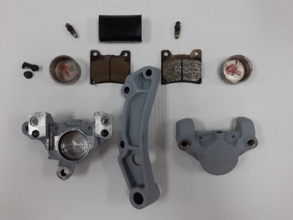 Nu is de remklauw achter aan de beurt. Inmiddels heb ik nieuwe RVS remleidingen besteld. Op aanraden van Edwin laat ik het Tstuk aan de voorkant vervallen. De twee leidingen van 83 cm lengte worden direct aan de rempot op het stuur bevestigd. Uiteraard worden de remklauwen van een revisiesetje voorzien.