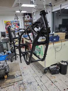 Het frame is gespoten met een 2 componenten mat zwart. Nee, niet gepoedercoat, omdat dat weliswaar een goed eindresultaat geeft maar ook een dikke laag vormt. Dat kan lastig zijn met monteren en bovendien zijn beschadigingen moeilijk weg te werken. En spuiten is tenslotte een eenvoudig proces dat je zelf kunt uitvoeren